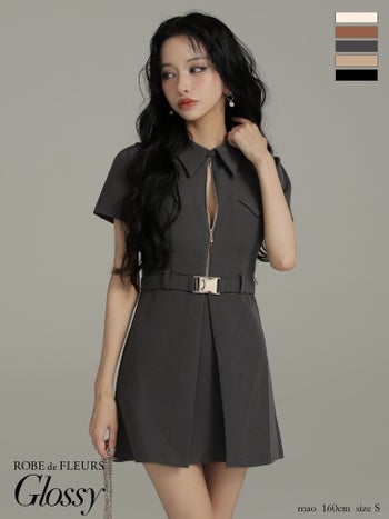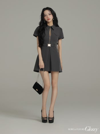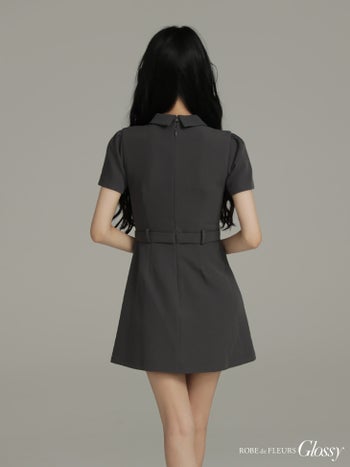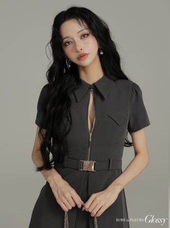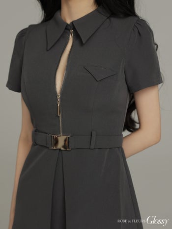 3. 【Glossy by ROBE de FLEURS/グロッシー】ジップデザイン ワンカラー 半袖 襟付き ウエストベルト フレアミニドレス (GL4617)