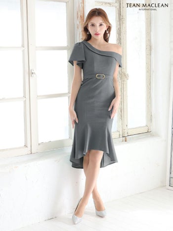 4. SALE【JEANMACLEAN/ジャンマクレーン】アシンメトリー 半袖 肩あき ウエストベルト マーメイド タイト膝丈ドレス(45962)