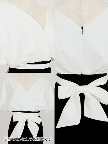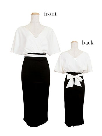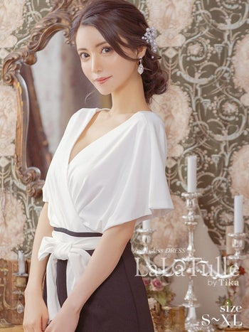 高品質でロープライスなオリジナルキャバドレス♪ LaLaTulle[ララチュール]カシュクール バイカラー 袖あり タイトミニドレス[ホワイト×ブラック][S/M/L/XL]