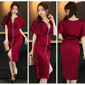 4. 【Veautt/ヴュート】贅沢 フロントジップ タックベルト サテン タイトひざ丈ドレス (VT05222)