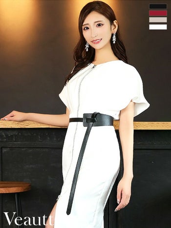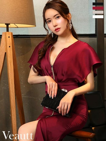 4. 【Veautt/ヴュート】シンプル フロントジップ タックベルト サテン タイトひざ丈ドレス (VT05222)