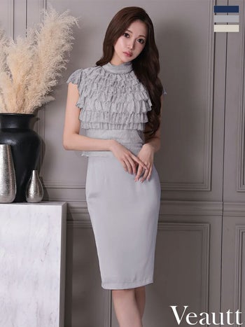 キャバドレス Veautt ヴュート フリル ビジュー 半袖 エレガント ハイネック フロントレース 膝丈ドレス