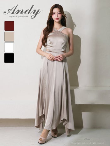 4. 【Andy/アンディ】クロスデザイン ホルターネック ウエストカット バックカット サテン アシンメトリー Aラインロングドレス(anok3008)