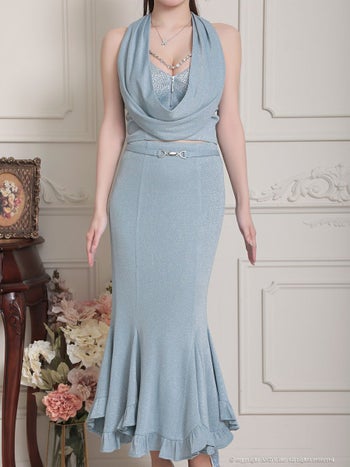 4. 【an/アン】セットアップ ホルターネック ラインストーン ワンカラー バックリボン ジップデザイン マーメイドロングドレス(aoc3851)
