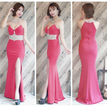 セクシー デコルテ ホルターネック ウエストパールビジュータイトロングドレス