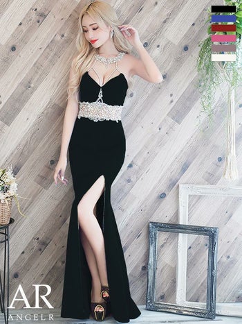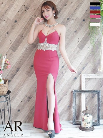4. 【Angel R/エンジェルアール】ワンカラー デコルテ ホルターネック ウエストパールビジュータイトロングドレス (AR22340)