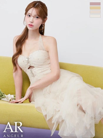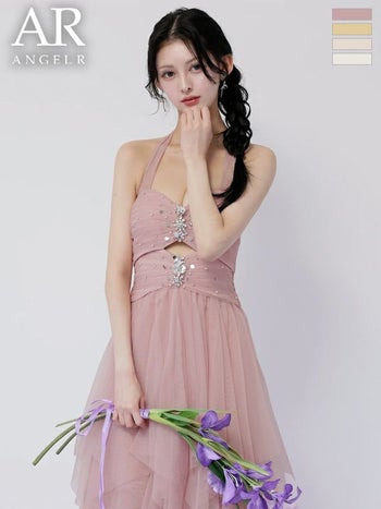 ボリュームたっぷりシルエットがcute♡ 【Angel R/エンジェルアール】フロントビジュー ウエストカット ホルターネック フリル メッシュ ヘムライン ネックリボン Aラインロングドレス (AR26808)