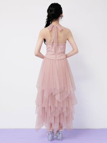 4. 【Angel R/エンジェルアール】ホルターネック ヘムライン ネックリボン フロントビジュー ウエストカット フリル メッシュ Aラインロングドレス (AR26808)