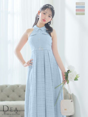 Lあり!襟×ベルトデザインでスマートな印象に★ 【DEA.by ROBE de FLEURS/ディア】シンプル 襟付き ホルターネック チェックレース Aラインロングドレス(DE3251)