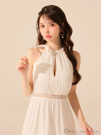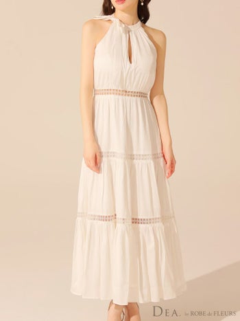 4. 【DEA.by ROBE de FLEURS/ディア】ホルターネック リボンタイ エレガント ワンカラー スカラップレース Aラインロングドレス(DE3479)