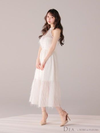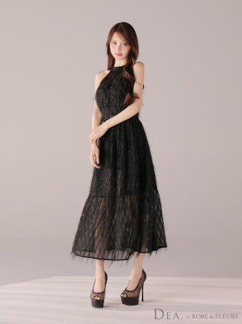 4. 【DEA.by ROBE de FLEURS/ディア】エレガント ホルターネック リボン ウエストベルト シースルー フリンジジャガード サテン Aラインロングドレス(DE4318)