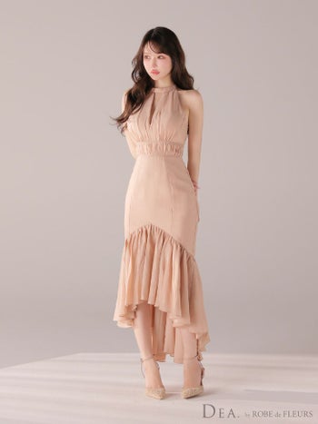 Lあり!エレガントなワンピース★ 【DEA.by ROBE de FLEURS/ディア】バストカット ウエストギャザー バックオープン オーガンジー サテン エレガント ホルターネック リボン Aラインロングドレス(DE4611)
