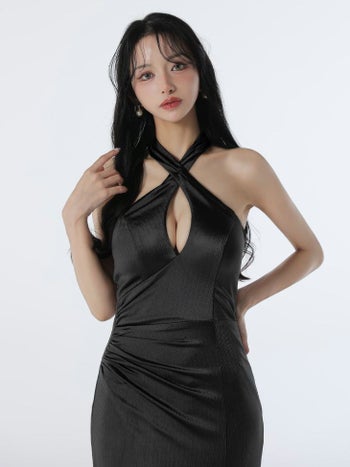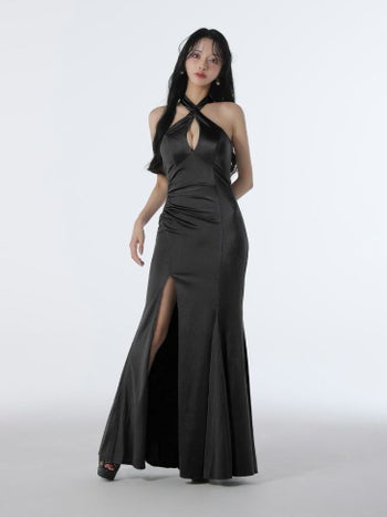 3. 【Glossy by ROBE de FLEURS/グロッシー】セクシー クロス ホルターネック バストカット バックオープン スリット ストレッチサテン マーメイドロングドレス (GL3948)