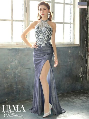 3. 【IRMA/イルマ】ラメニット レース刺繍 スリット入り ホルターネック バースデー タイトロングドレス(91738)