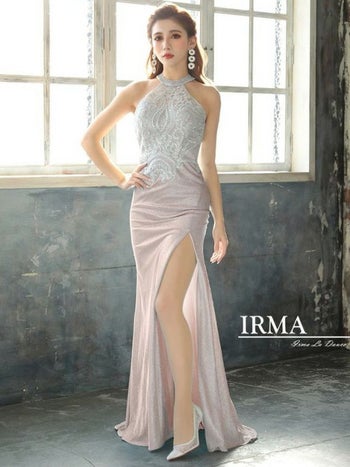 4. 【IRMA/イルマ】ラメニット レース刺繍 スリット入り ホルターネック バースデー タイトロングドレス(91738)