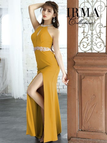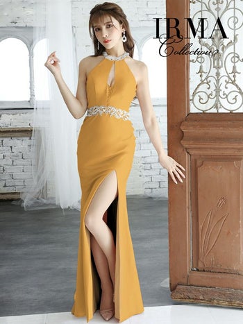 4. 【IRMA/イルマ】ワンカラー 刺繍付 ホルターネック タイトロングドレス[マスタード]