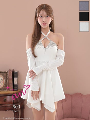 XSあり!ホルターネックで華奢魅せ♡ 【an/アン】長袖 ジップデザイン ビジュー ホルターネック アシンメトリー フレアミニドレス(aoc3947)