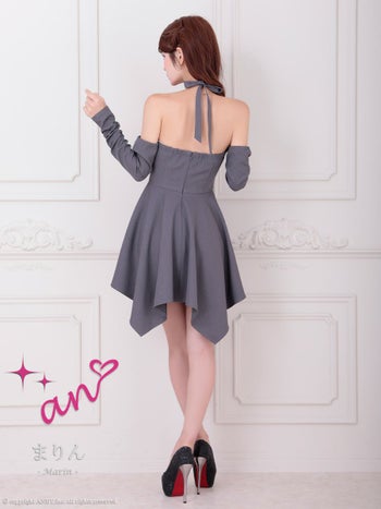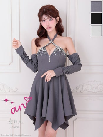 キャバドレス an 長袖 ジップデザイン ビジュー ホルターネック アシンメトリー フレアミニドレス