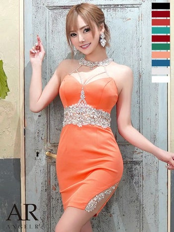 4. 【Angel R/エンジェルアール】デコルテ ウエストビジュー ワンカラー ホルターネック タイトミニドレス (AR21245)