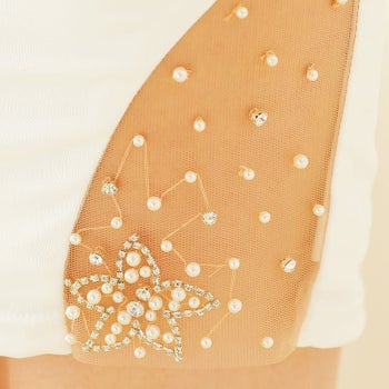 パールチェーンチャーム スリットシアー ビジューパール フラワーレース ドレープ ホルターネック タイトミニドレス