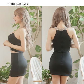3. 【Angel R/エンジェルアール】オープンバスト ホルターネック ビジュー フロントパールチェーン セットアップ セクシー タイトミニドレス (AR24334)