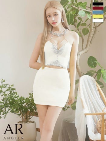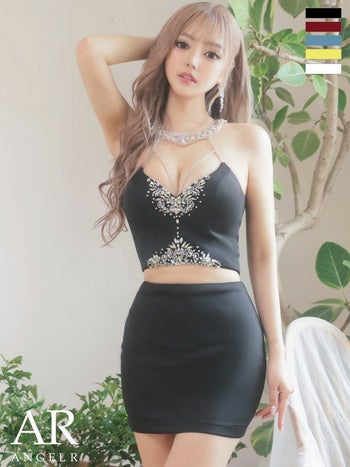 XSあり!センターパールは取り外し可能☆ 【Angel R/エンジェルアール】ホルターネック ビジュー フロントパールチェーン セットアップ セクシー オープンバスト タイトミニドレス (AR24334)