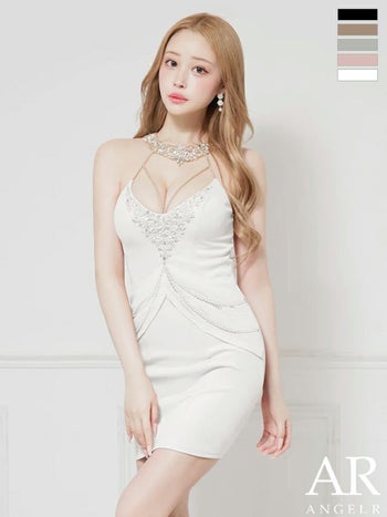 XSあり!美デコルテを演出する一着♪ 【Angel R/エンジェルアール】ビジュー ホルターネック シフォンドレープ パールチェーン タイトミニドレス (AR25230)