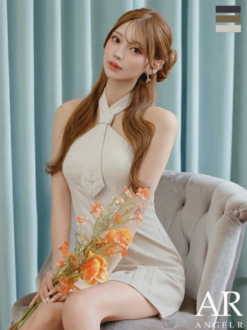 キャバドレス Angel R エンジェルアール ネクタイデザイン ビジュー パール プリーツ シンプル ホルターネック フレアミニドレス