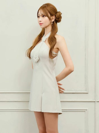 4. 【Angel R/エンジェルアール】ネクタイデザイン ビジュー パール プリーツ シンプル ホルターネック フレアミニドレス (AR25241)