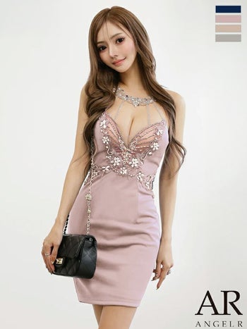 XSあり!繊細なビジューで目を惹くバストに♪ 【Angel R/エンジェルアール】ホルターネック バストシアー アッパーフラワー セクシー タイトミニドレス (AR25356)