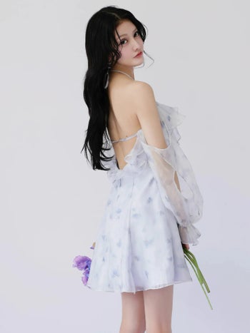 4. 【Angel R/エンジェルアール】フリル 肩あき 長袖 バックオープン シフォン フラワープリント ホルターネック フレアミニドレス (AR26801)