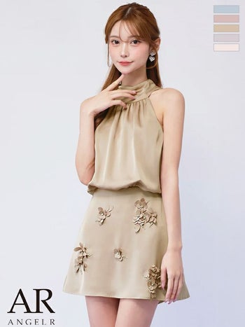 3. 【Angel R/エンジェルアール】サテン ワンカラー ホルターネック リボン ウエストマーク フラワーレース フレアミニドレス (AR26803)