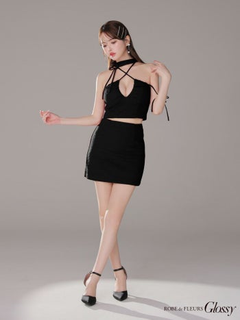 3. 【Glossy by ROBE de FLEURS/グロッシー】オープンバスト ホルターネック アシンメトリー リボン セットアップ セクシー タイトミニドレス (GL3438)