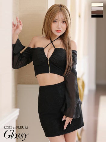 3. 【Glossy by ROBE de FLEURS/グロッシー】オープンバスト シアースリーブ ホルターネック ジップデザイン オフショルダー 長袖 セットアップ セクシー タイトミニドレス (GL3736)