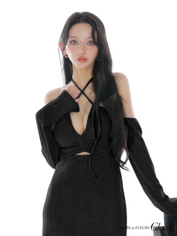 5. 【Glossy by ROBE de FLEURS/グロッシー】長袖 アシンメトリー ホルターネック リブニットセクシー ラメ 肩あき カッティング タイトミニドレス (GL3959)