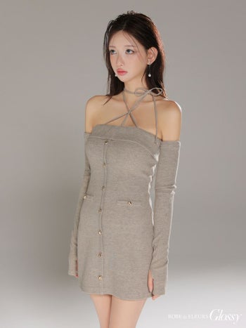 5. 予約商品【2月上旬入荷予定】【Glossy by ROBE de FLEURS/グロッシー】ネックリボン ホルターネックフロントボタン 長袖 リブニット アームウォーマー付き タイトミニドレス (GL4321)