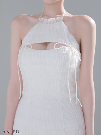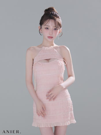 3. 【ANIER./アニエル】ホルターネック チュール リボン バストカット チュール アメリカンスリーブ フリル タイトミニドレス (anier4061)