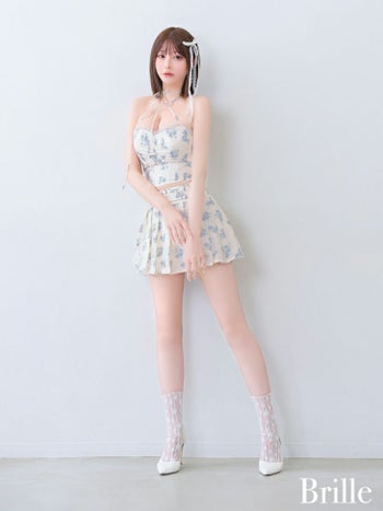 キャバドレス Brille ブリエ リボン 花柄 セットアップ プリーツスカート ハートカット ホルターネック フレアミニドレス