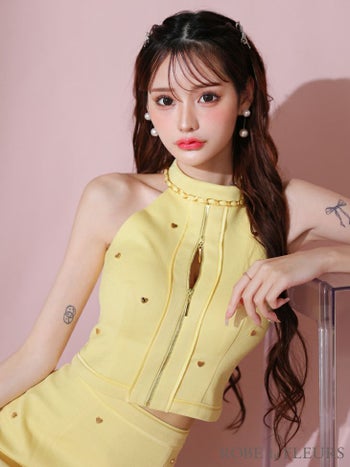 XSあり!可愛さで虜にしちゃう一着♡ 【ROBEdeFLEURS/ローブドフルール】セットアップ ジップデザイン チェーン ガーリー ハートスタッズ ホルターネック タイトミニドレス (fm3751)