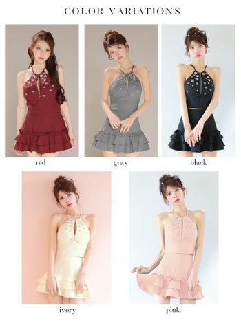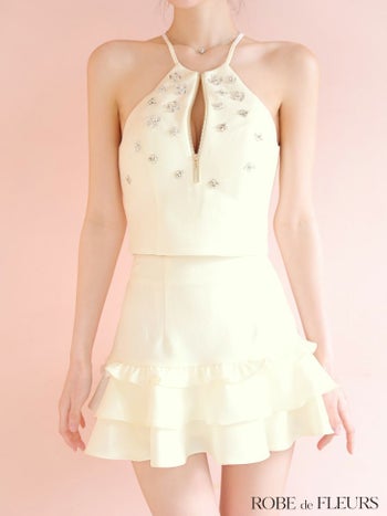 XSあり!華やかで可愛いデザイン♡ 【ROBEdeFLEURS/ローブドフルール】セットアップ ジップデザイン ホルターネック ビジュー フレアミニドレス (fm3799)