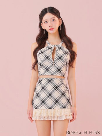 素材 ポリエステルウールライクチェック生地、レース