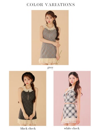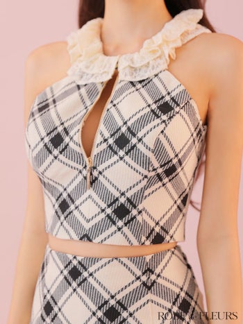 3. 【ROBEdeFLEURS/ローブドフルール】ホルターネック セットアップ ジップドレス チェック柄 フリル ガーリー タイトミニドレス (fm4222)