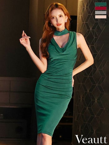 4. 【Veautt/ヴュート】セクシー オープンバスト バストドレープ ホルターネック ノースリーブ 膝丈ドレス (VT022415)