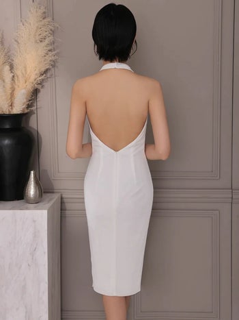 3. 【Veautt/ヴュート】 バストドレープ ホルターネック セクシー ワンカラー ショルダーチャーム スリット 膝丈ドレス (VT022517)