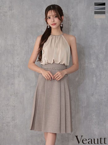 3. 【Veautt/ヴュート】サテン バイカラー ホルターネック チェーン フレア 膝丈ドレス (VT022529)