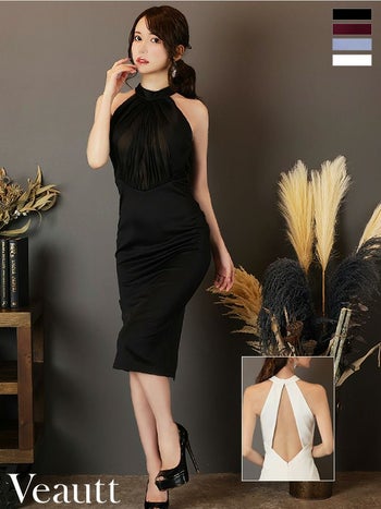 4. 【Veautt/ヴュート】ウエスト切り替え バックオープン アメリカンスリーブ フロントシフォンギャザー ワンカラー ホルターネック タイトひざ丈ドレス(VT09222)