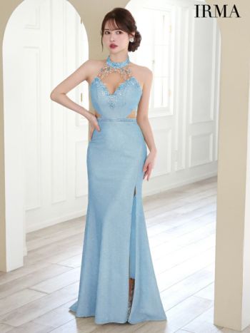 スタイルが美しく見えるデザイン♪ 【IRMA/イルマ】セクシー オープンバスト ホルターネック ビジュー くびれ透け ラメニット スリット タイトロングドレス (41742)