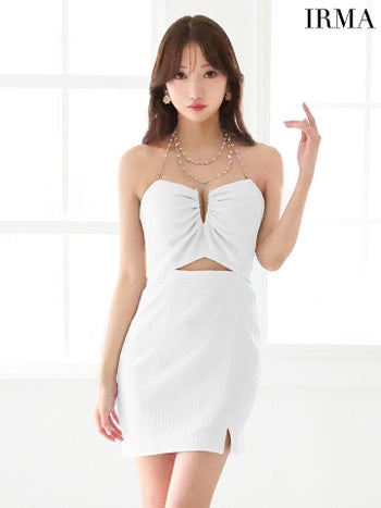 XSあり!セクシーなデザイン♪ 【IRMA/イルマ】セクシー オープンバスト チェーンビジュー ホルターネック ウエストカット 柄織りニット タイトミニドレス(55027)