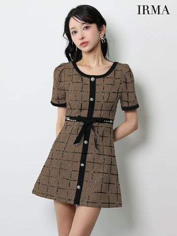 3. 【IRMA/イルマ】ツイード 半袖 チェック柄 リボンベルト ラメ フレアミニドレス (55107)