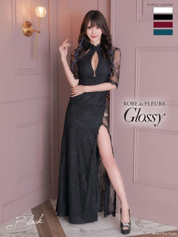キャバドレス Glossy by ROBE de FLEURS レース 袖あり ジップデザイン バックネックリボン セクシー サイドスリット タイトロングドレス
